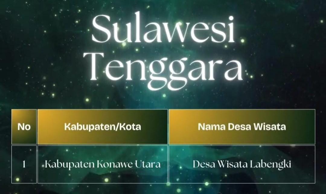 Kemudian Desa Wisata Kollo Soha (Kabupaten Wakatobi), Desa Wisata Kulali (Kabupaten Wakatobi), Desa Wisata Sambandete (Kabupaten Wakatobi), Desa Wisata Tanjung Taipa (Kabupaten Konawe Utara), Desa Wisata Labengki (Kabupaten Konawe Utara), Desa Wisata Sambandete (Konawe Utara), dan Desa Wisata Liangkaburi (Kabupaten Muna).(sm-01)