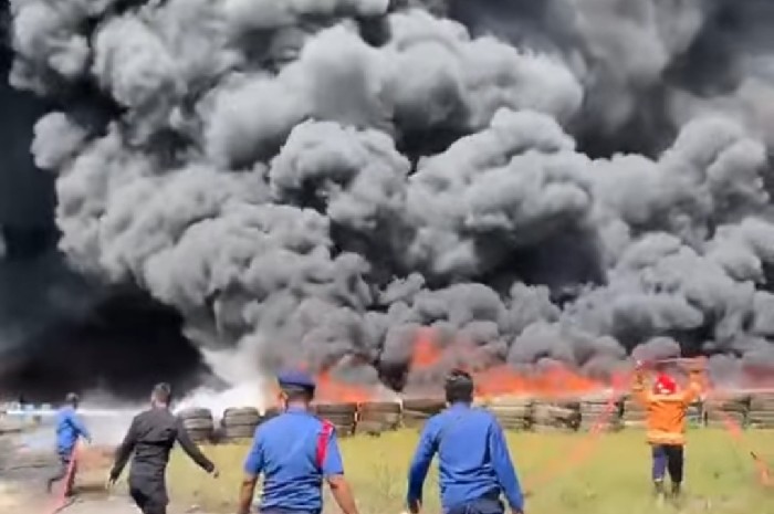 Namun, upaya pemadaman sempat sulit dilakukan karena material ban bekas yang mudah terbakar dan area pabrik.