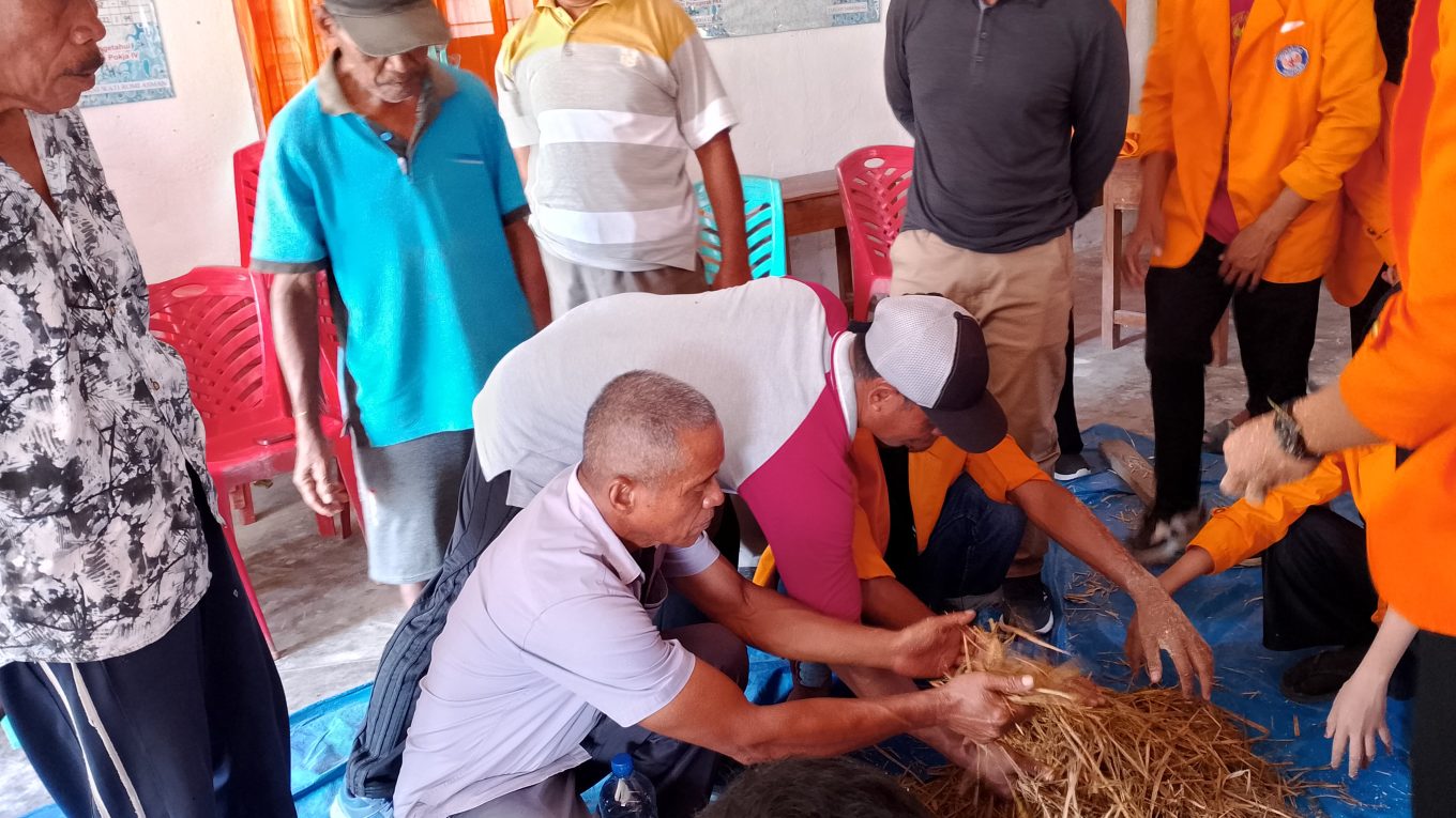 Mahasiswa juga memberitahukan langkah praktis dalam pembuatan pakan awetan, mulai dari pengumpulan bahan baku, proses pembuatan, hingga cara mengaplikasikannya kepada ternak ruminansia.