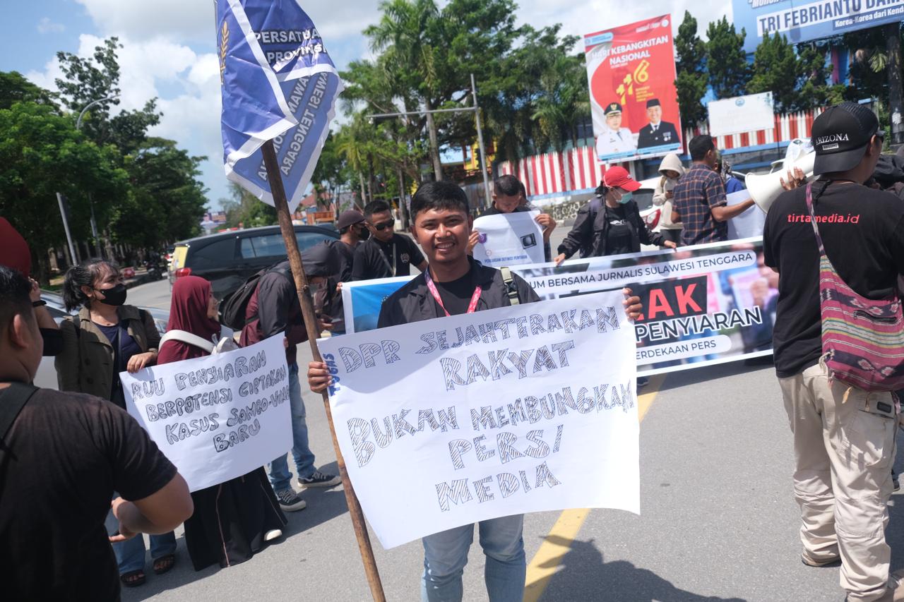Para jurnalis yang menggelar aksi demontrasi di Kota Kendari ini merupakan gabungan dari Persatuan Wartawan Indonesia (PWI), Aliansi Jurnalis Independen (AJI), dan Ikatan Jurnalis Televisi Indonesia (IJTI).