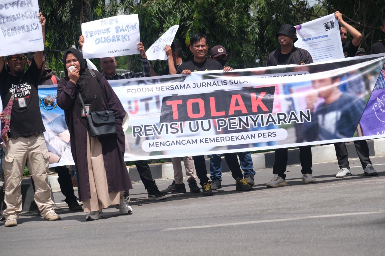 Sambil membentangkan spanduk dan banner,mereka bergantian menyuarakan penolakan terhadap sejumlah pasal yang mengancam kebebasan pers dan menghalangi tugas jurnalistik yang diselundupkan dalam revisi UU Penyiaran.