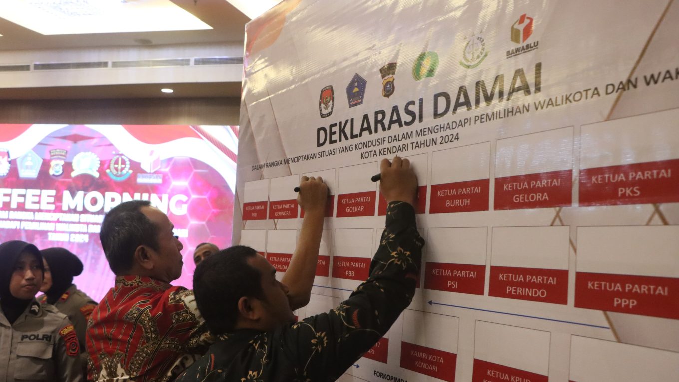 Penandatanganan Deklarasi Pemilu Damai ini dilakukan oleh, Kapolresta Kendari Kombes Pol Aris Tri Yunarto, Pj Wali Kota Kendari diwakili Staf Ahli Bidang Kemasyarakatan, SDM, dan Kerja Sama Sudirham.
