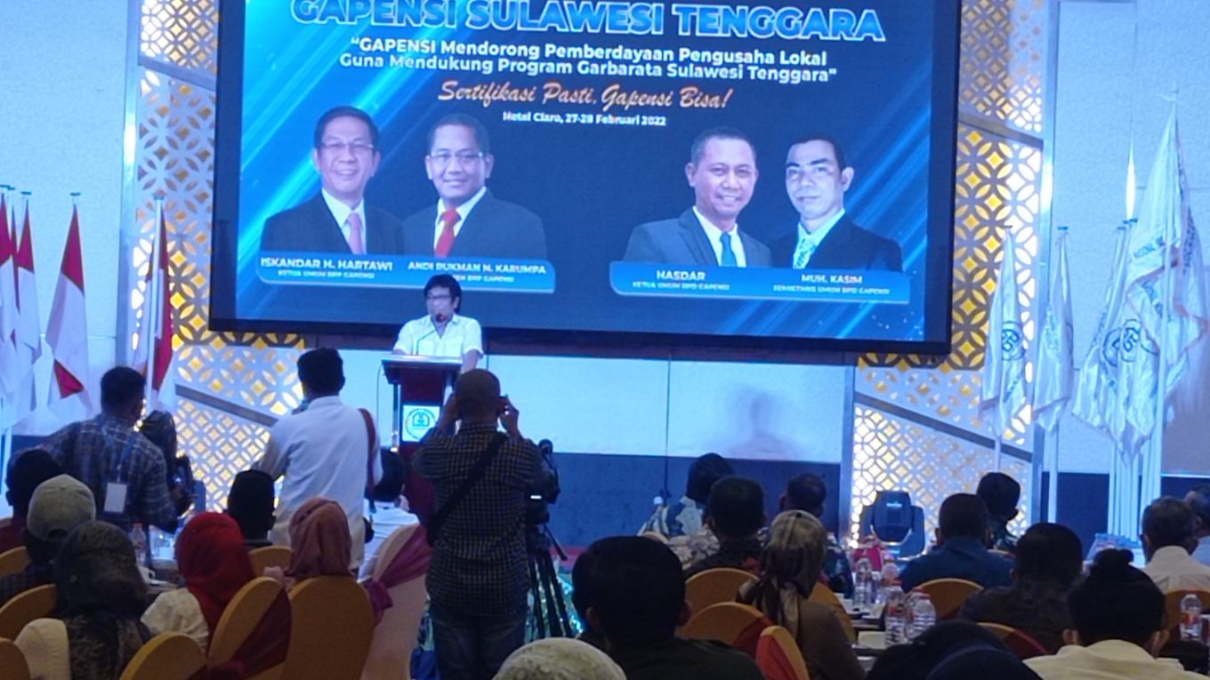 Ketgam: Ridwan Bae saat berbicara di Musda Gapensi Sulawesi Tenggara. Foto: SultraMerdeka.Com