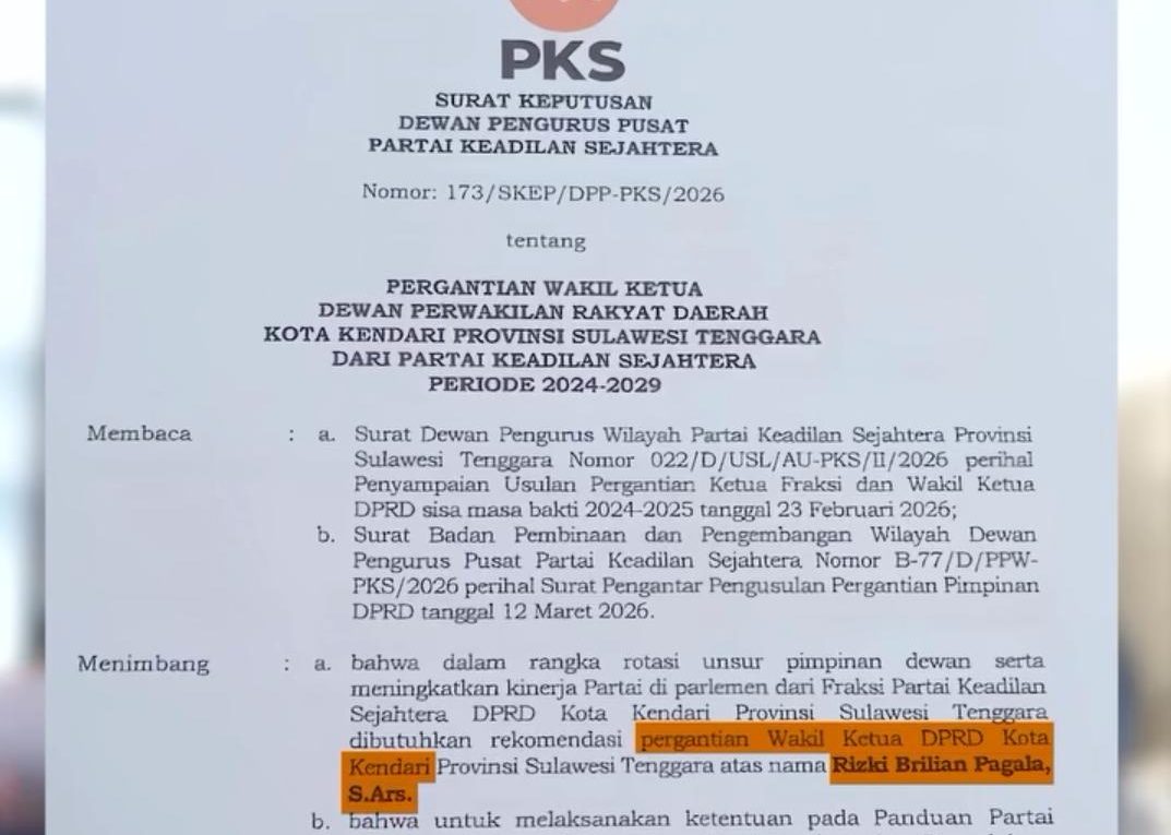 SULTRAMERDEKA.COM – Partai Keadilan Sejahtera (PKS) mendepak Rizki Brilian Pagala dari kursi Wakil Ketua I DPRD Kota Kendari. Pergantian tersebut diketahui melalui unggahan video Rizki Brilian Pagala di akun medsosnya pada Senin (20/4/2026).