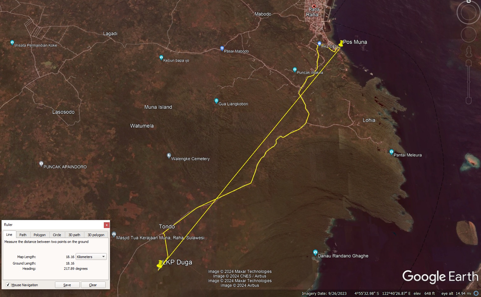 Jarak tempuh lokasi kejadian dengan Unit Siaga SAR Muna sekitar 22 km yang ditempuh dengan jalan darat.