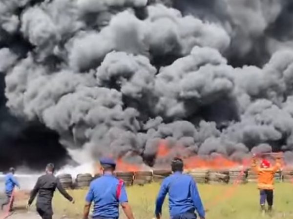 SULTRAMERDEKA.COM – Kebakaran hebat melanda sebuah pabrik ban bekas di Desa Lebo