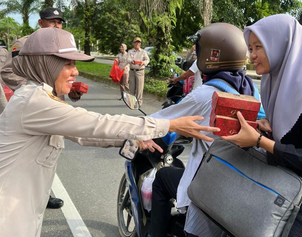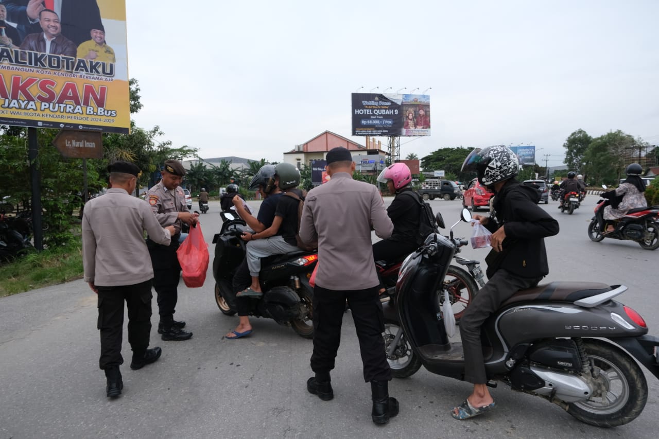 Personel Dit Reskrimum dan Dit Samapta Polda Sultra Bagikan Takjil kepada Masyarakat Kota Kendari
