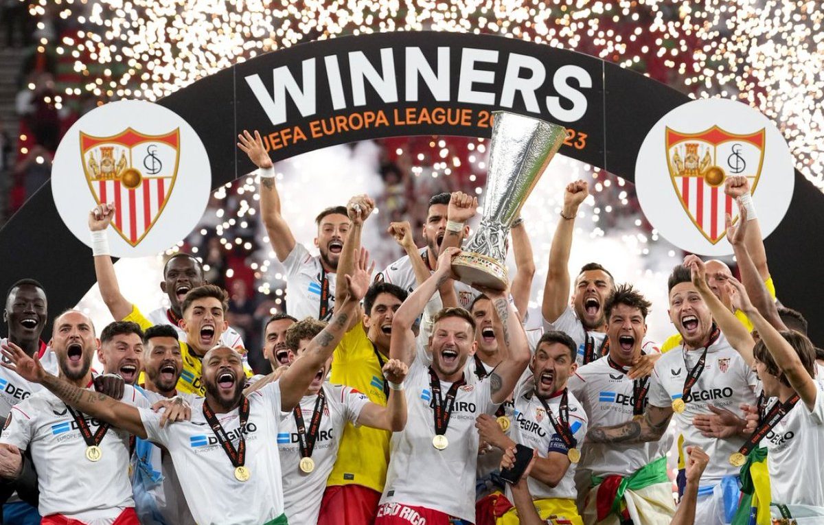 Ketgam: Pemain Sevilla saat mengangkat trofi Liga Europa. Foto: Twitter Sevilla.